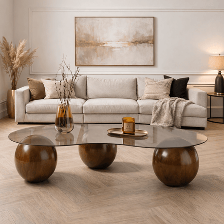 907,391.008,21Prezzo unitario /Non disponibileOrganische salontafel transparant glas walnoot bolpoten Sphere 120x70 cm