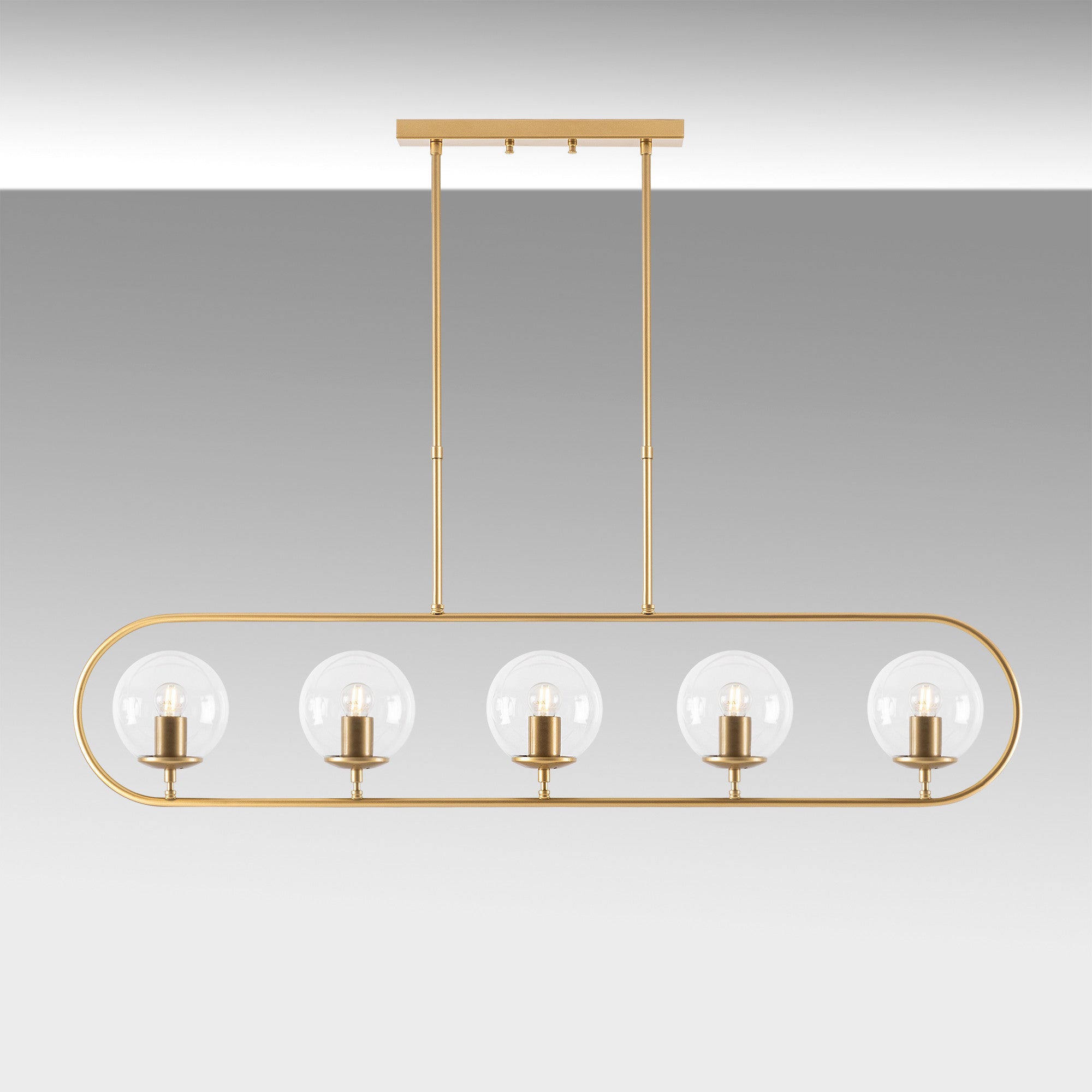 Descrizione e specifiche di Lampada a sospensione a 5 luci in vetro trasparente dorato Lucent