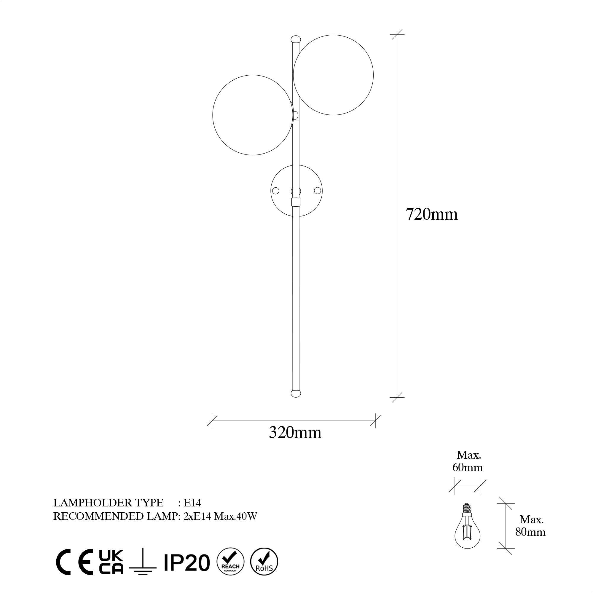 - Tipo di attacco: 2 x E14 Max 40 W