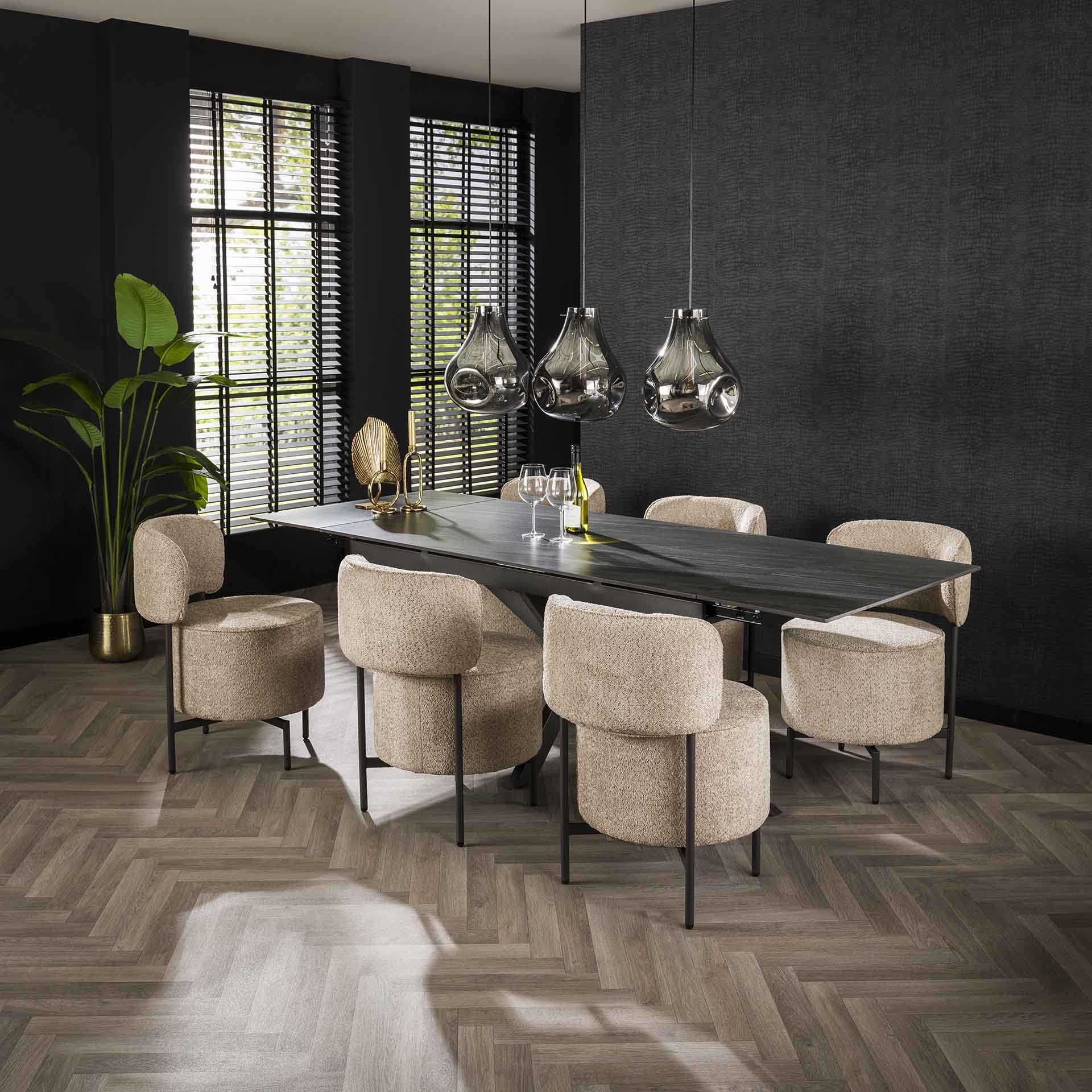 Porta stile e comfort nella tua sala da pranzo con la nostra bellissima sedia girevole Bouclé. Questa sedia non è solo girevole, ma offre anche un aspetto lussuoso grazie al tessuto bouclé di alta qualità in un caldo colore sabbia.