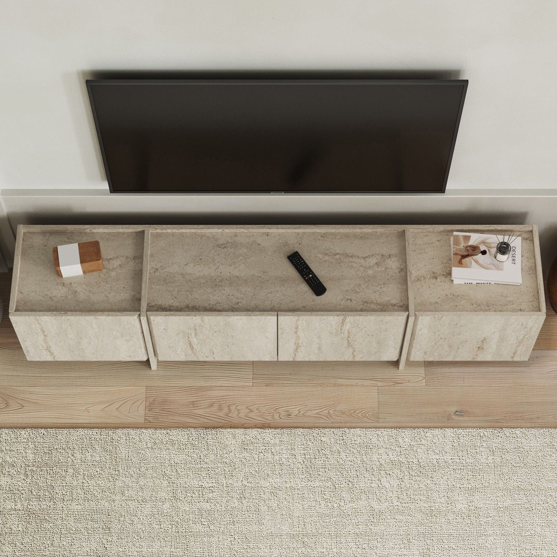 TV-meubel Lowen is meer dan alleen een plek voor je televisie; het is een statement piece. Het gebruik van travertin zorgt voor een sfeervolle basis in je zithoek. De verticale belijning op de deuren geeft het meubel diepte en een uniek karakter, terwijl het minimalistische onderstel zorgt voor een zwevend, luchtig effect.