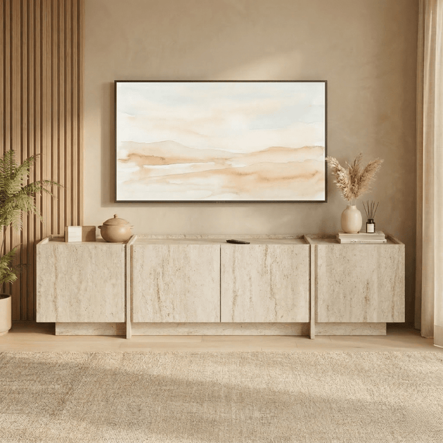 Geef je woonkamer een luxueuze upgrade met het TV-meubel Lowen. Dit prachtige meubel combineert de warme uitstraling van hoogwaardig travertin met een strak, tijdloos design. Dankzij de rustige uitstraling en natuurlijke texturen past de Lowen perfect in een Scandinavisch, Japandi of modern interieur.